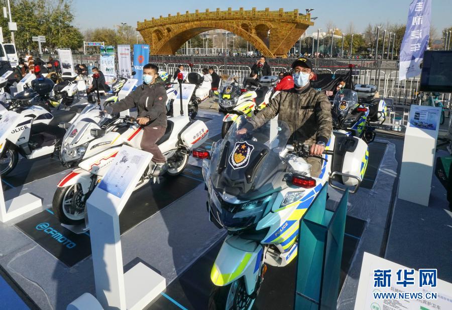 11月24日,工作人员在警用装备博览会上展示春风1250型(前右)警用摩托车。