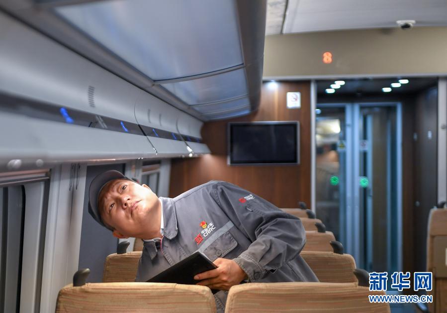 11月25日,在中车长春轨道客车股份有限公司高速动车组制造中心调试车间,罗昭强检查复兴号高铁列车装置的工作情况。新华社记者 张楠 摄
