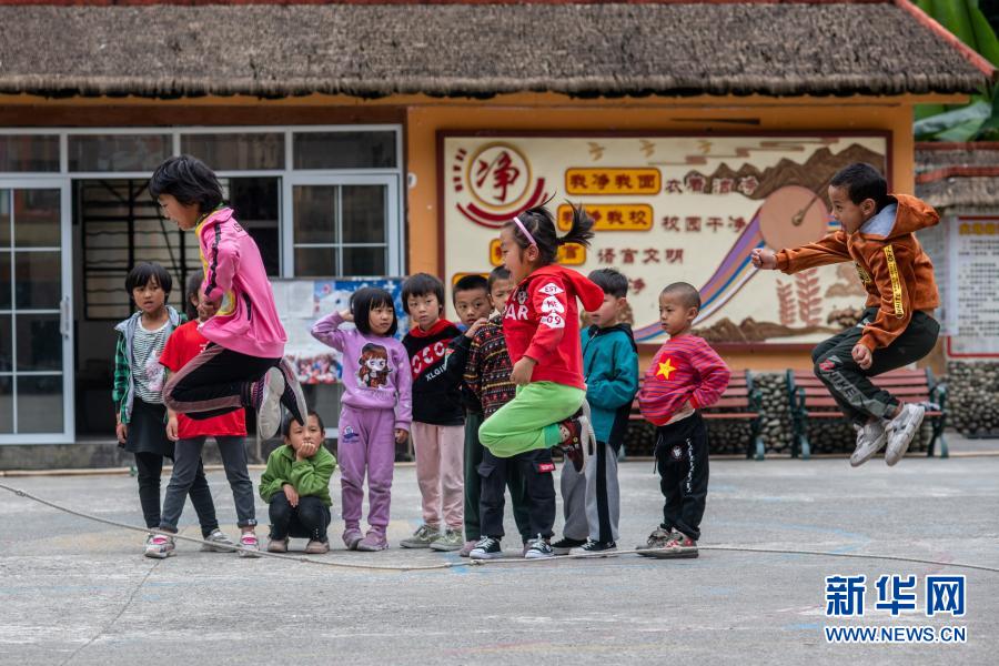 在独龙江乡九年一贯制学校,独龙族学生在操场上跳大绳(10月31日摄)。新华社记者 胡超 摄