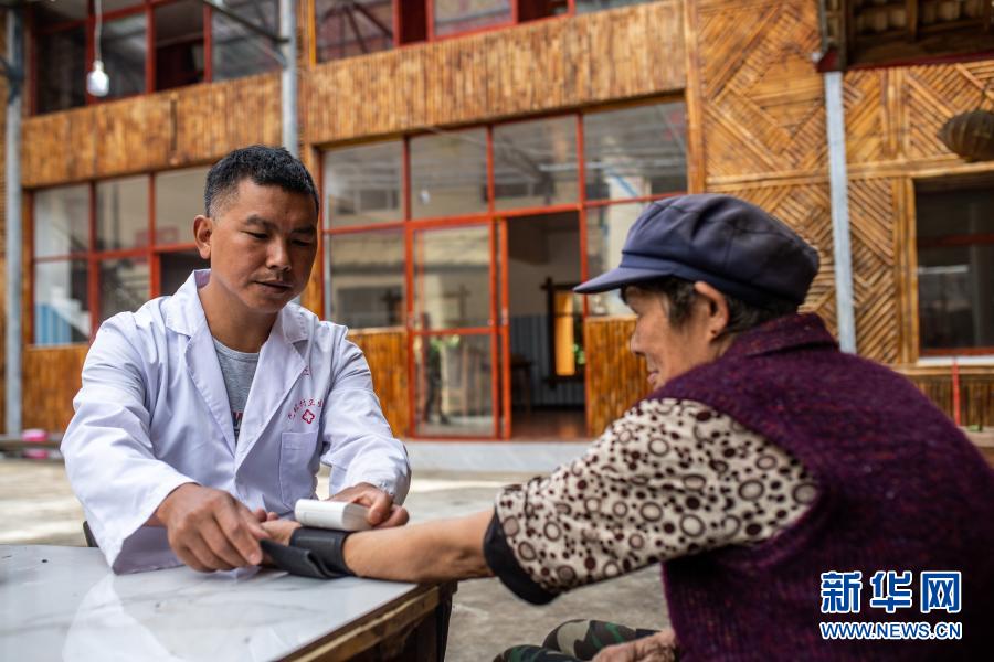 在云南省贡山独龙族怒族自治县独龙江乡巴坡村,村医孟文新给独龙族老人马桂英测量血压(10月26日摄)。新华社记者 胡超 摄