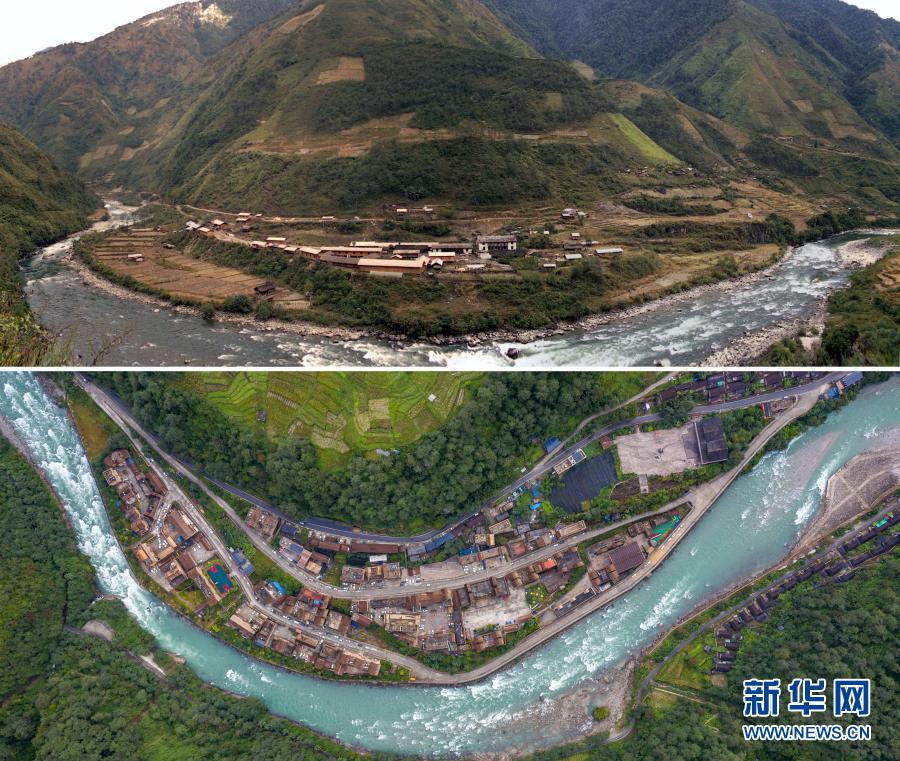 拼版照片上图:2001年拍摄的独龙江乡孔当村(资料照片);下图:10月27日拍摄的独龙江乡孔当村(无人机照片,新华社记者胡超摄)。新华社发