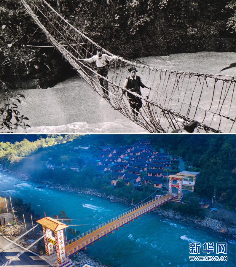 拼版照片上图:独龙族群众通过藤蔑桥(资料照片);下图:独龙江乡白来感恩大桥(10月29日摄,无人机照片,新华社记者胡超摄)新华社发