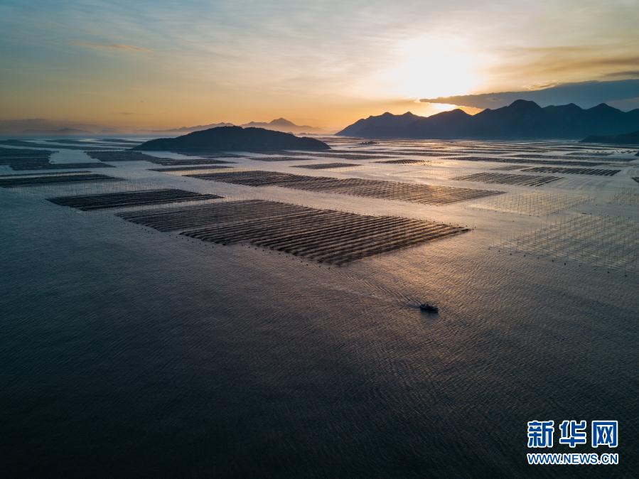 11月26日,在福建省宁德市霞浦县三沙镇,渔船在夕阳余晖中归港(无人机照片)。