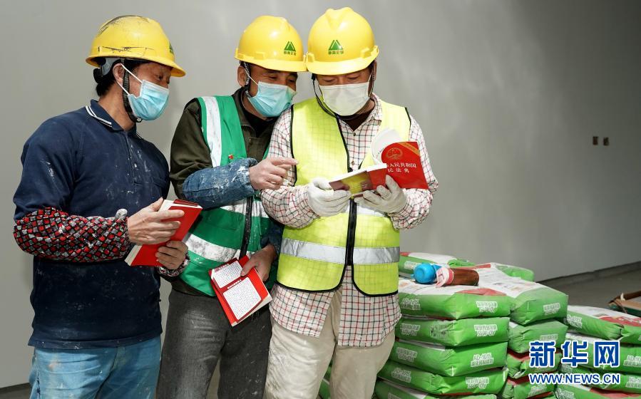 11月27日,建筑工人在活动结束后翻阅民法典。