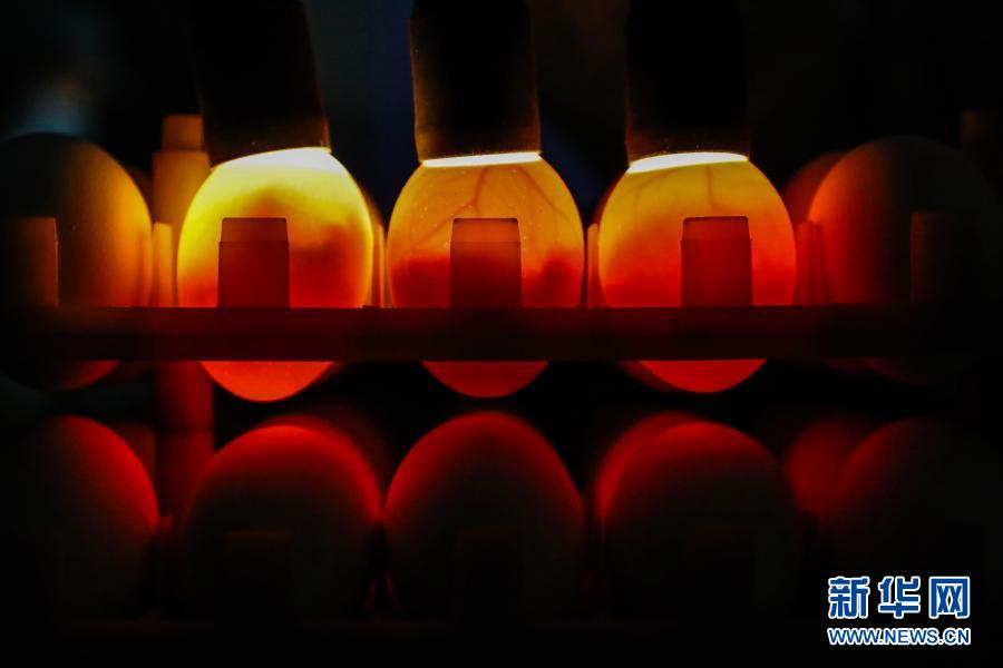 10月27日,在北京科兴生物制品有限公司流感疫苗生产车间,工作人员对鸡胚进行照检,中间的为合格鸡胚。透过蛋壳,小鸡胚胎的血管清晰可见,如果鸡胚的血管模糊不清或看不见,则不能用来生产疫苗。