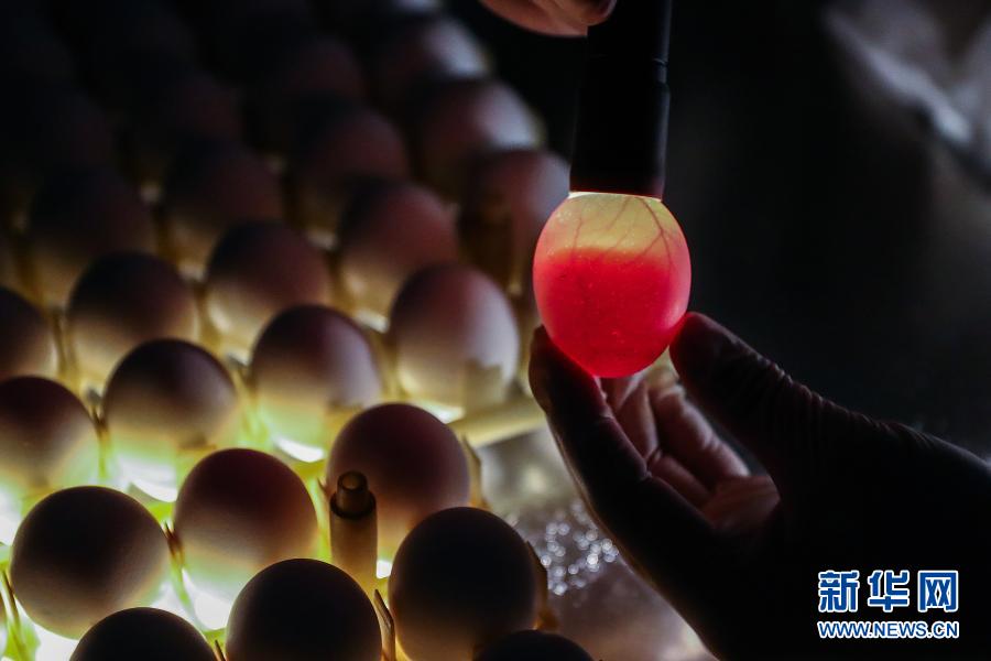 10月27日,在北京科兴生物制品有限公司流感疫苗生产车间,工作人员对鸡胚进行照检。透过蛋壳,小鸡胚胎的血管清晰可见,如果鸡胚的血管模糊不清或看不见,则不能用来生产疫苗。新华社记者 张玉薇 摄