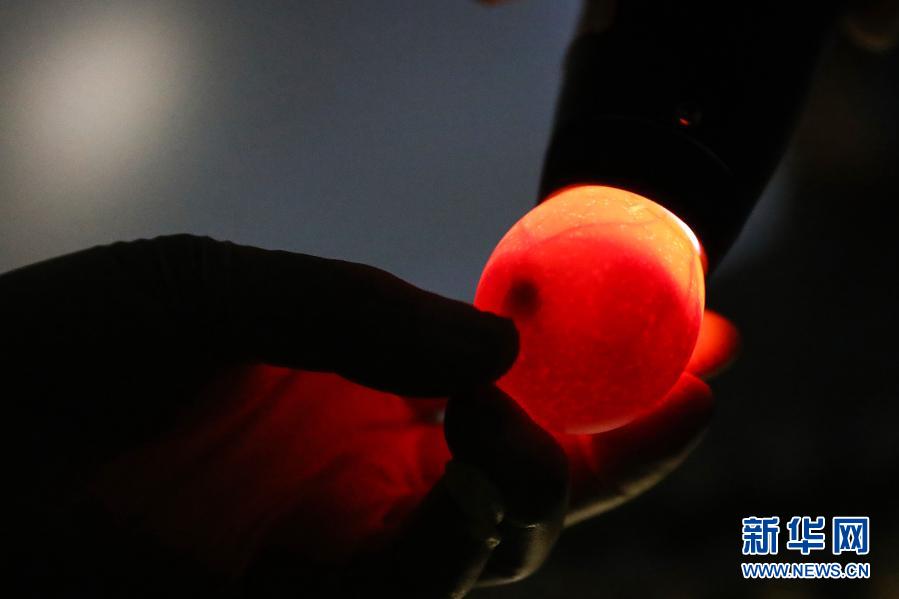 3月27日,在北京科兴生物制品有限公司流感疫苗生产车间,工作人员对鸡胚进行照检。透过蛋壳,小鸡胚胎的血管清晰可见,如果鸡胚的血管模糊不清或看不见,则不能用来生产疫苗。新华社记者 张玉薇 摄