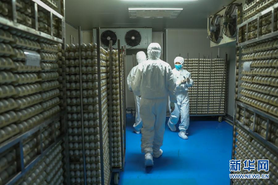 10月27日,在北京科兴生物制品有限公司流感疫苗生产车间,工作人员在冷胚间内工作。新华社记者 张玉薇 摄