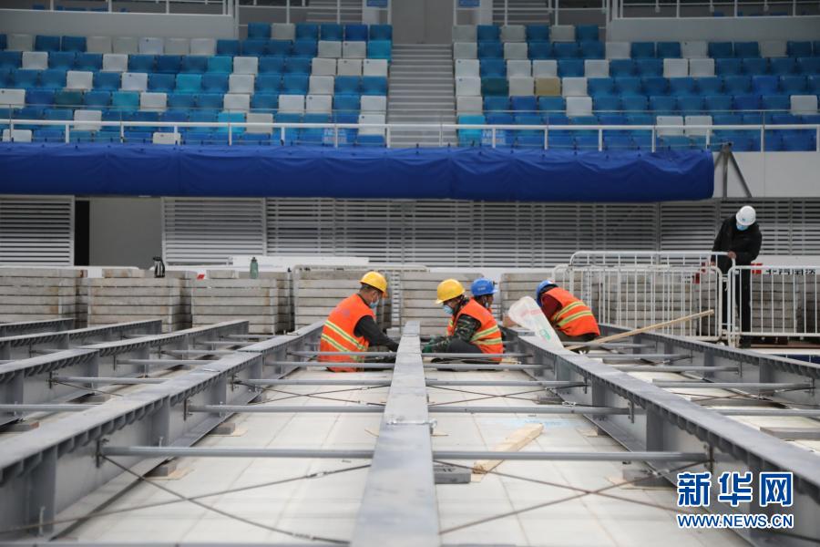 11月27日,工人在国家游泳中心“水立方”比赛大厅进行场地转换结构搭建。