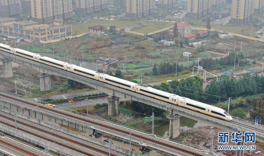 行驶在盐通高铁线上的动车组列车(11月27日摄,无人机照片)。新华社发(许丛军 摄)