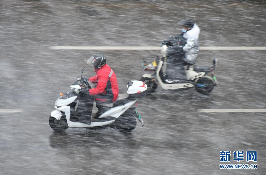 11月28日,骑行者在山东省烟台市街头冒雪出行。当日,山东烟台迎来今冬首场降雪。烟台市气象台28日9时20分发布道路结冰黄色预警信号。新华社发(孙文潭 摄)