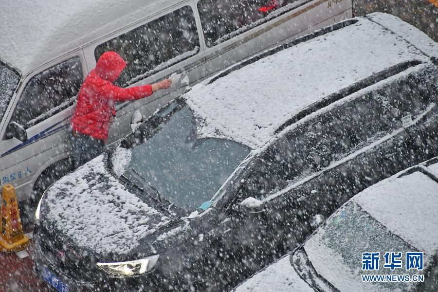 11月28日,市民在山东省烟台市街头清理车上积雪。当日,山东烟台迎来今冬首场降雪。烟台市气象台28日9时20分发布道路结冰黄色预警信号。新华社发(孙文潭 摄)