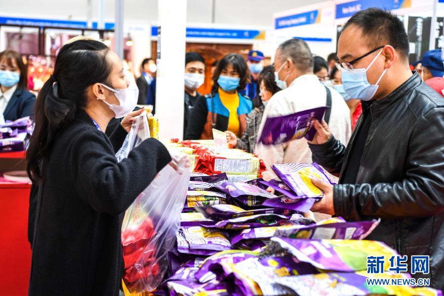 11月30日,在南宁国际会展中心,观众(右)在选购商品。