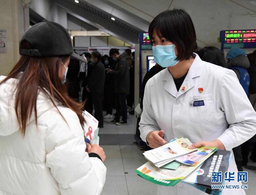 12月1日,北京市海淀医院医务人员(右)在向市民发放预防艾滋病宣传品。