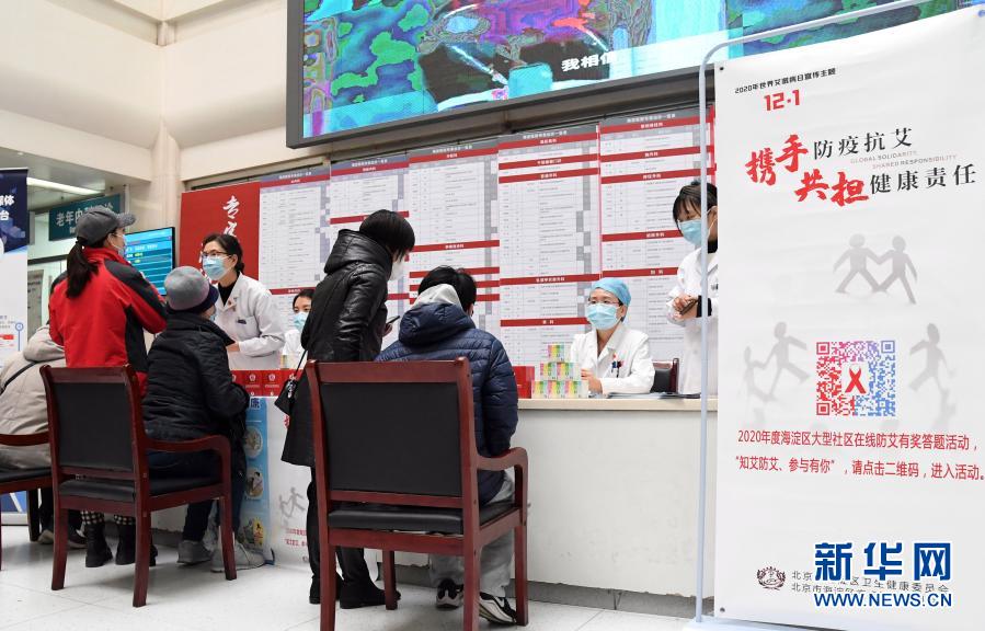 12月1日,北京市海淀医院医务人员向市民介绍预防艾滋病相关知识。