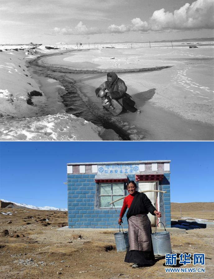这张拼版照片的上图:西藏纳木湖乡一名牧民在河边取水(资料照片);下图:那曲市聂荣县白雄乡的央金卓玛从村口的饮水安全工程井里取水回家(2011年11月9日摄)。新华社发