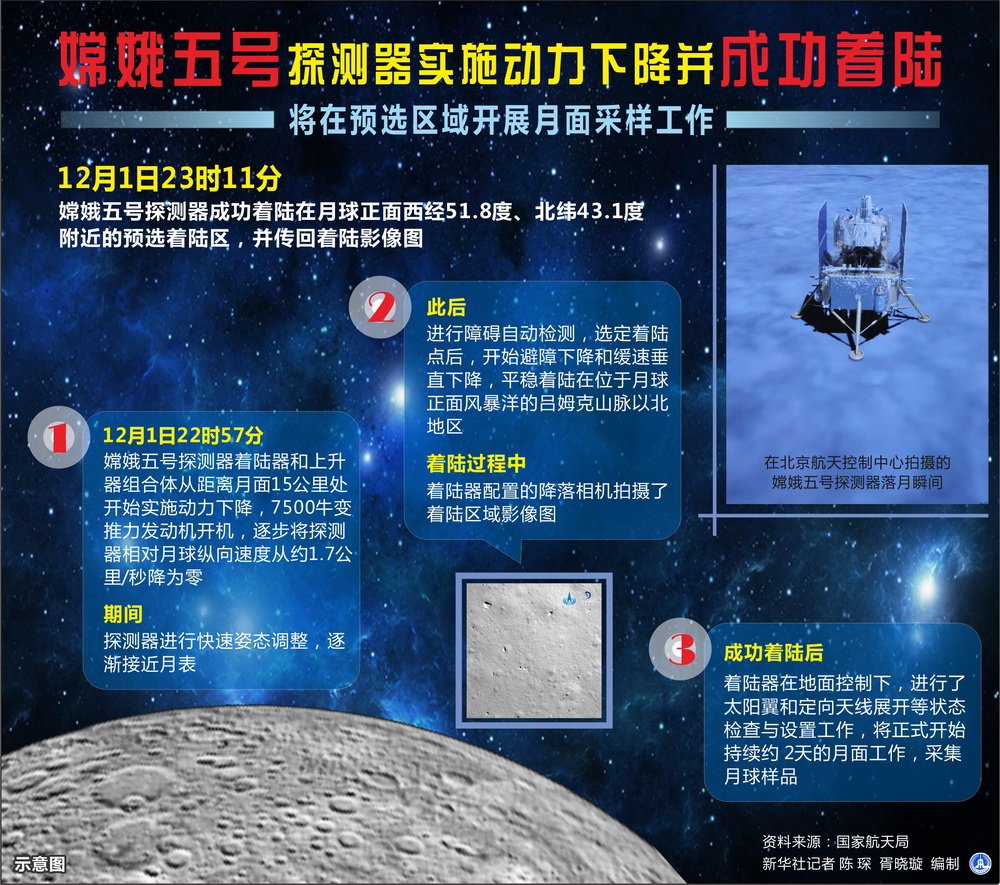 嫦娥五号探测器实施动力下降并成功着陆 将在预选区域开展月面采样工作。新华社记者 陈琛 编制