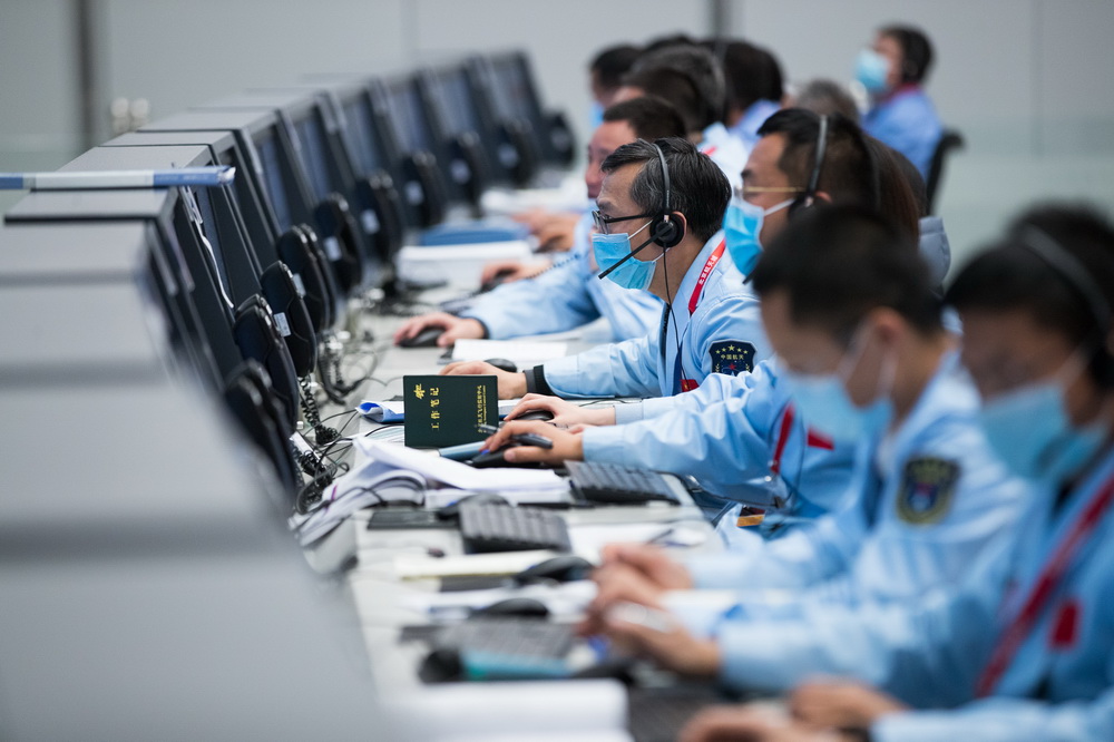 12月1日,在北京航天飞行控制中心,航天科技人员在监测嫦娥五号探测器工作状态。新华社记者 金立旺 摄