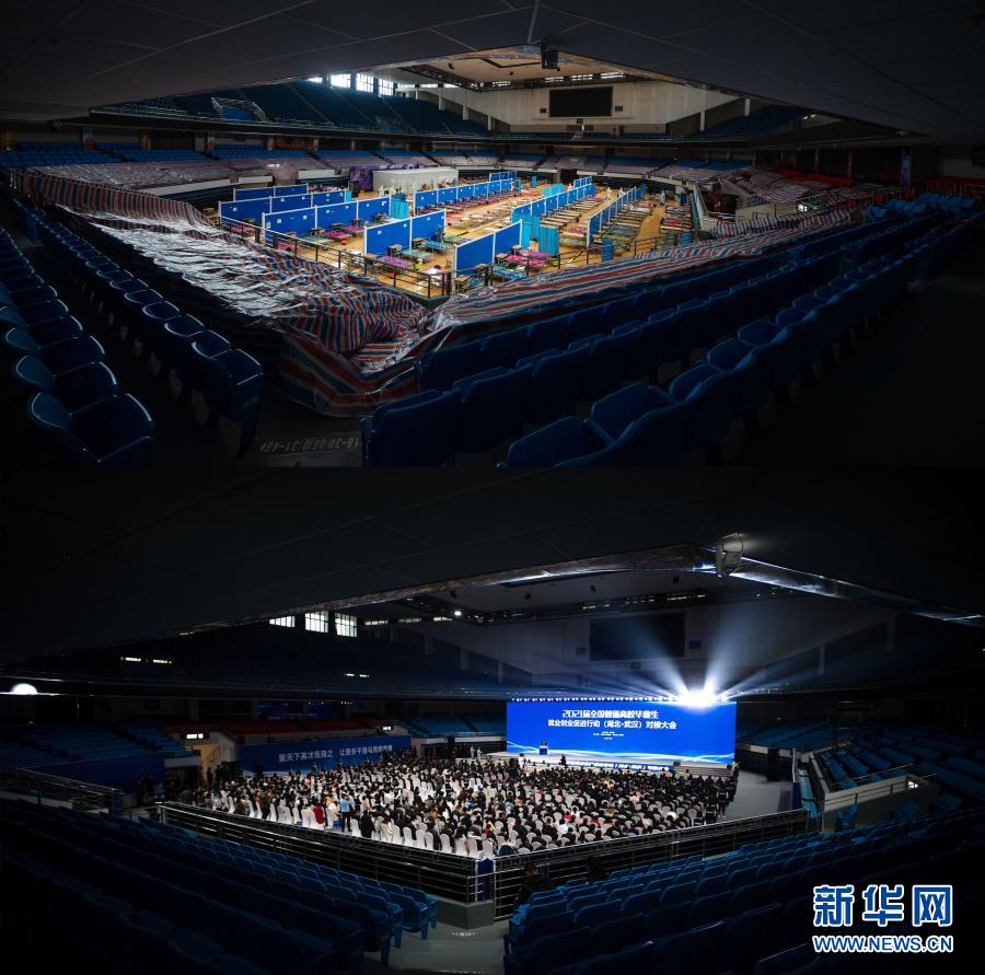 拼版照片:上图为3月10日拍摄的武汉武昌方舱医院。当日,武昌方舱医院正式休舱(新华社记者费茂华摄);下图为12月2日,疫情期间作为武昌方舱医院的武汉洪山体育馆举行2021届全国普通高校毕业生就业招聘会等活动(新华社记者肖艺九摄)。