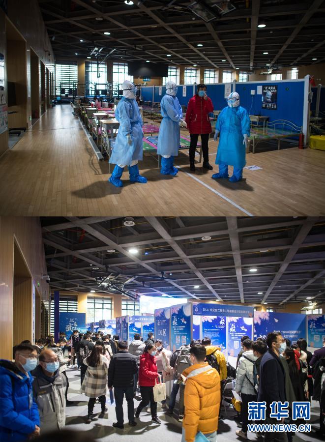 拼版照片:上图为3月10日,医护人员护送痊愈患者出舱。当日,武汉武昌方舱医院正式休舱;下图为12月2日,疫情期间作为武昌方舱医院的武汉洪山体育馆举行2021届全国普通高校毕业生就业招聘会等活动。