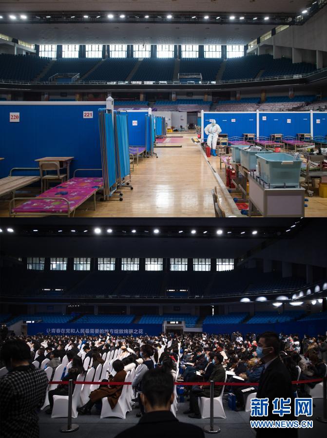 拼版照片:上图为3月10日,医护人员护送痊愈患者出舱后小憩。当日,武汉武昌方舱医院正式休舱;下图为12月2日,疫情期间作为武昌方舱医院的武汉洪山体育馆举行2021届全国普通高校毕业生就业招聘会等活动。