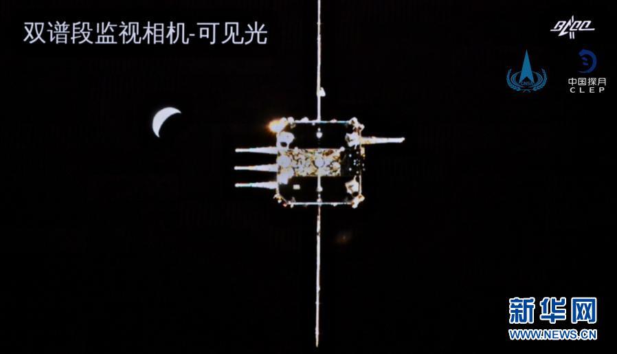 记者从国家航天局获悉,12月6日5时42分,嫦娥五号上升器成功与轨道器返回器组合体交会对接,并于6时12分将月球样品容器安全转移至返回器中。这是我国航天器首次实现月球轨道交会对接。新华社发(国家航天局供图)