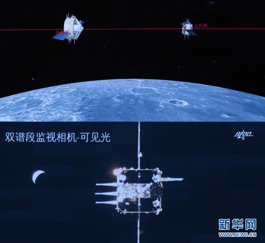 记者从国家航天局获悉,12月6日5时42分,嫦娥五号上升器成功与轨道器返回器组合体交会对接,并于6时12分将月球样品容器安全转移至返回器中。这是我国航天器首次实现月球轨道交会对接。新华社记者 金立旺 摄