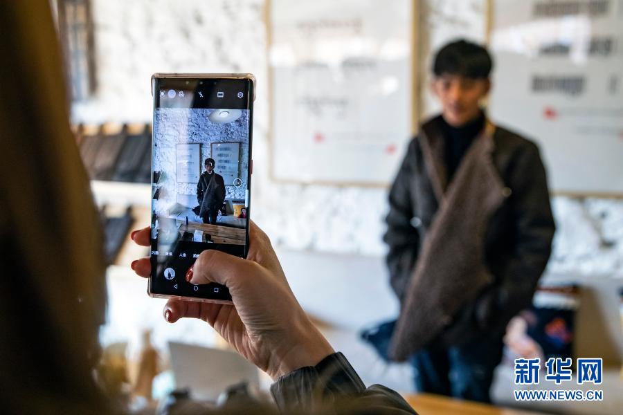 在理塘县勒通古镇的仓央嘉措微型博物馆,一名从外地赶来的粉丝用手机给丁真拍照(12月3日摄)。这里将是丁真未来的工作场所之一。新华社记者 沈伯韩 摄