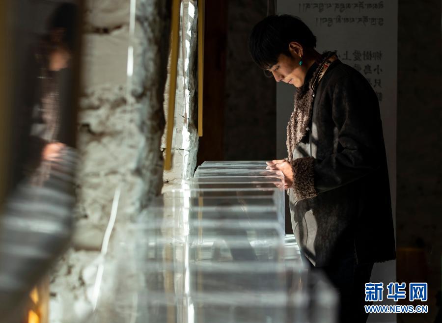 在理塘县勒通古镇的仓央嘉措微型博物馆,丁真小心地调整展品展示柜的位置。作为当地文旅企业员工,这里将是丁真未来的工作场所之一(12月3日摄)。新华社记者 沈伯韩 摄