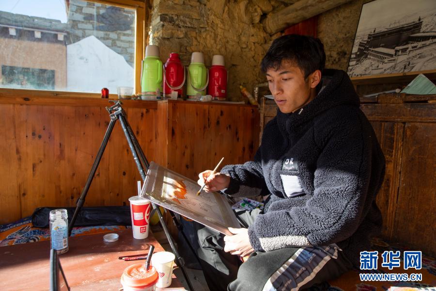 在理塘县勒通古镇的理塘康巴人博物馆,与丁真同样是理塘县文旅体投资发展有限公司员工的22岁的格乃澎措在绘制水粉画,这幅画将作为旅游纪念品出售(12月2日摄)。格乃澎措曾是贫困户,在政府的政策扶持下已经脱贫。在当地,还有许多像丁真和格乃澎措一样的藏族年轻人,为了家乡的旅游事业发展而努力。新华社记者 沈伯韩 摄