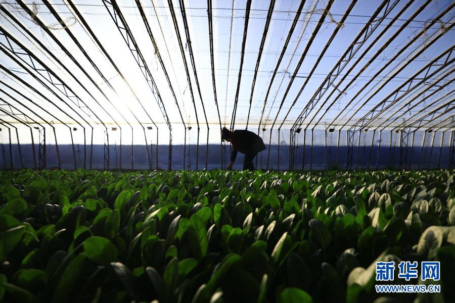 12月7日,河北省唐山市丰南区黄各庄镇双坨村农民在大棚内管护菠菜。