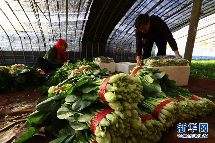 12月7日,河北省唐山市丰南区黄各庄镇双坨村的农民在大棚内收获小油菜。新华社发(李秀清 摄)