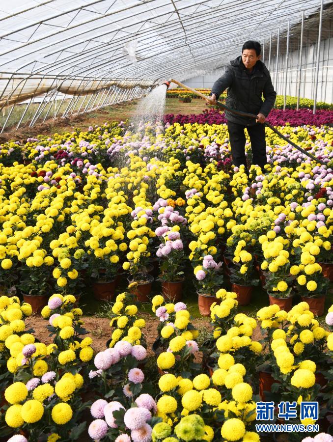 12月7日,山东省枣庄市山亭区桑村镇大河村的农民在温室大棚内管护乒乓菊。新华社发(李宗宪 摄)