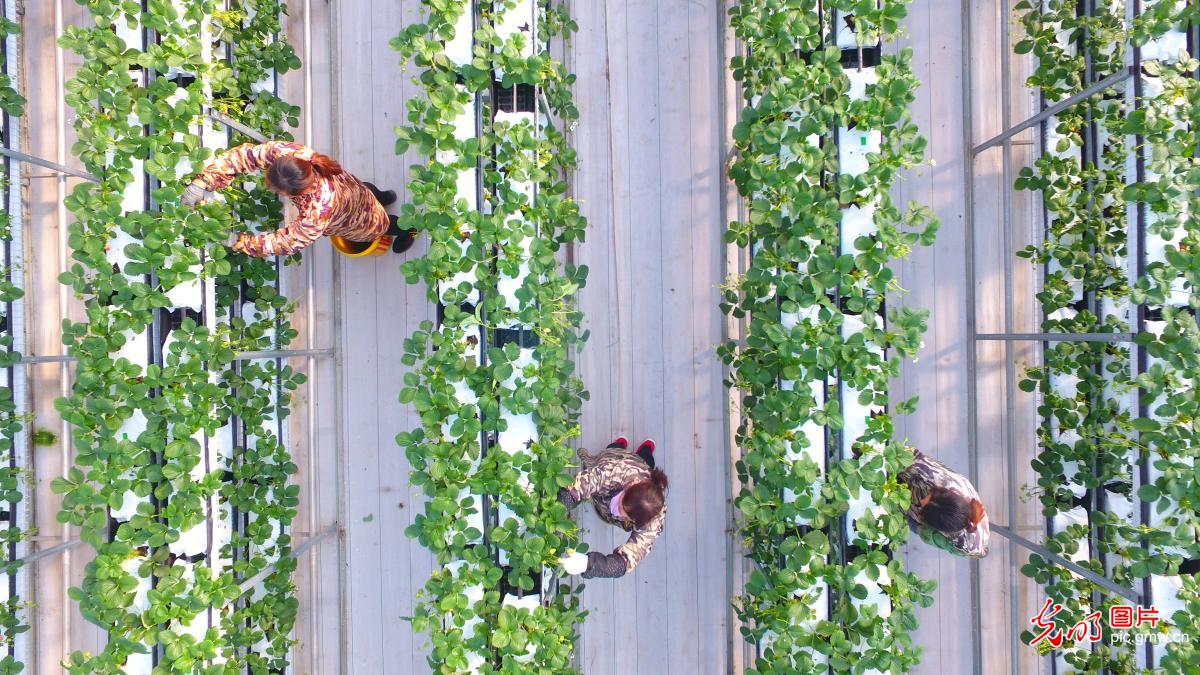 2020年12月7日,在山东省聊城市茌平区贾寨镇耿店村一智能温室大棚里,工人们在忙着管理草莓。当日,迎来二十四节气中的"大雪",聊城茌平区当地的菜农们忙着打理设施蔬菜,智能温室内一派绿意盎然的忙碌景象。(赵玉国摄/光明图片)