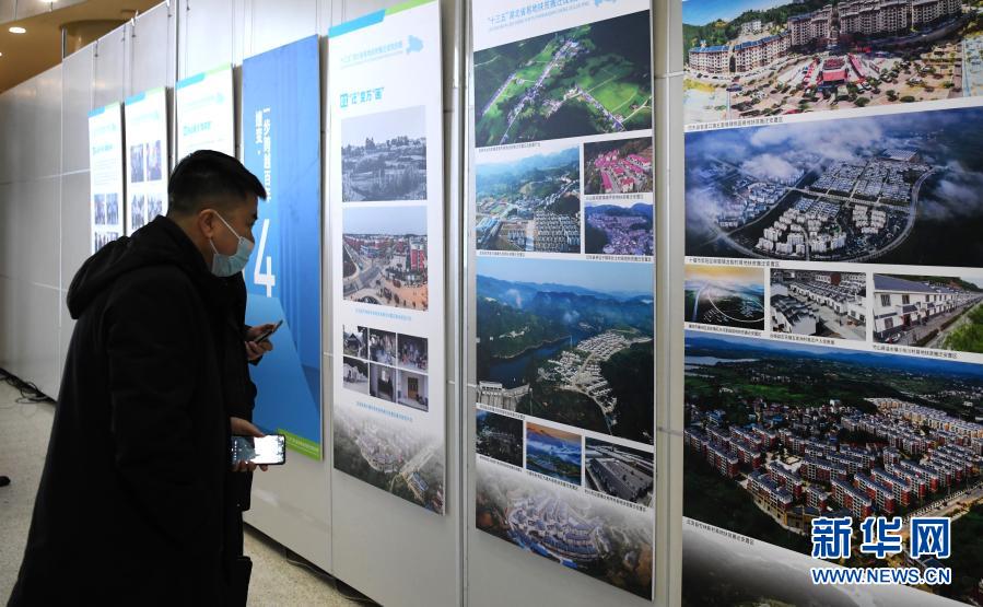 12月8日,观众在湖北省易地扶贫搬迁成就展上观看图片。