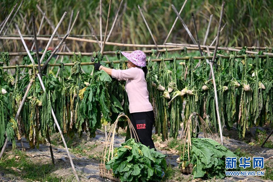 12月8日,在柳州市鱼峰区里雍镇长沙村,农民在晾晒头菜。新华社发(黎寒池 摄)