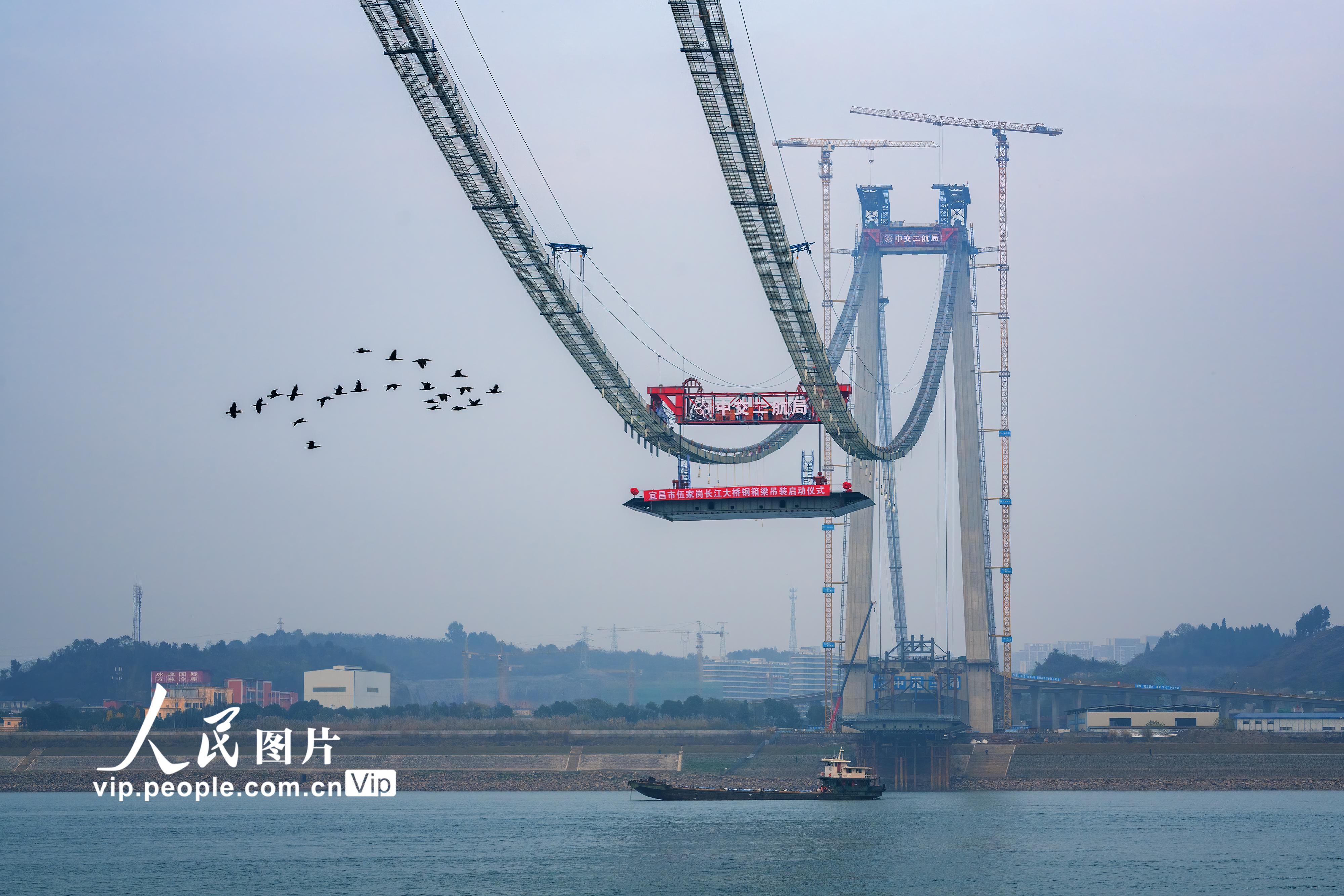 宜昌市伍家岗长江公路大桥是国务院确定的《长江经济带综合立体交通走廊规划》中湖北省19条过江通道之一,大桥全长2813米,是一座双塔钢箱梁悬索桥,为保护中华鲟、江豚等长江珍稀生物,该桥采用主跨1160米悬索桥一跨过江的方案,按城市快速路、双向六车道标准设计建造。王耿 摄 (人民图片网)
