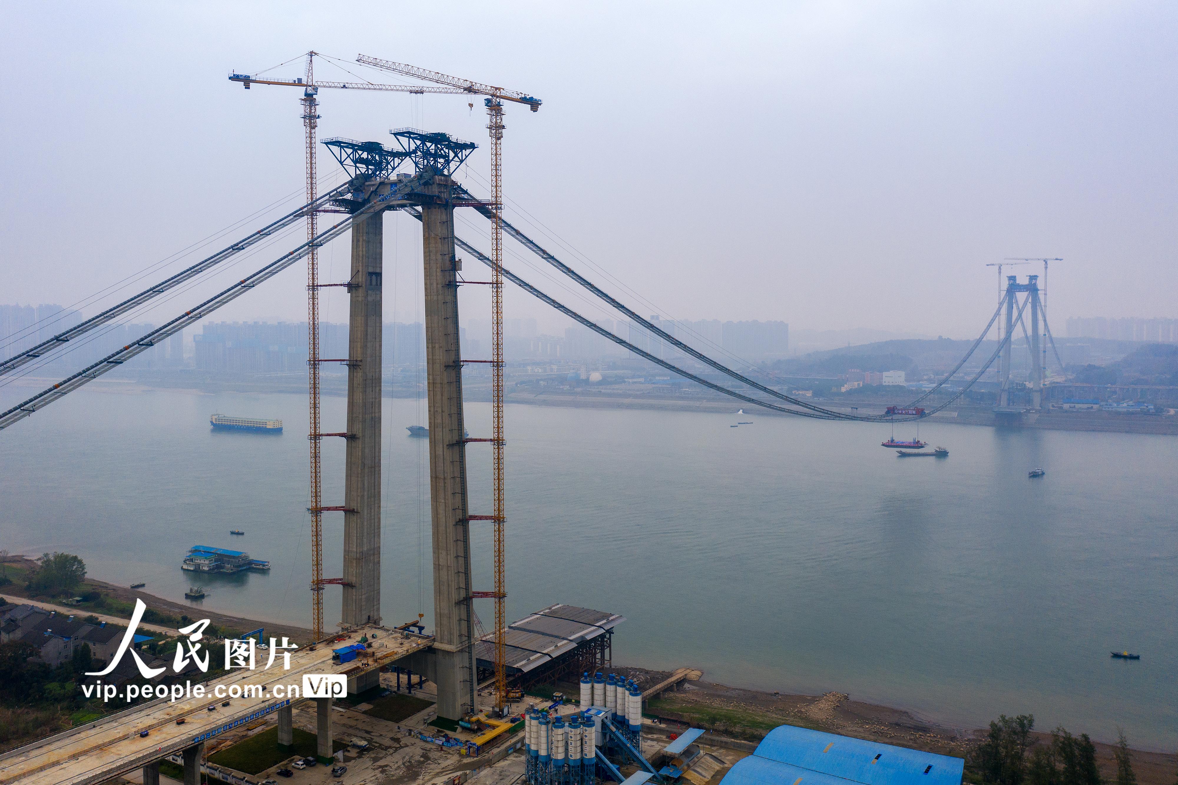 宜昌市伍家岗长江公路大桥是国务院确定的《长江经济带综合立体交通走廊规划》中湖北省19条过江通道之一,大桥全长2813米,是一座双塔钢箱梁悬索桥,为保护中华鲟、江豚等长江珍稀生物,该桥采用主跨1160米悬索桥一跨过江的方案,按城市快速路、双向六车道标准设计建造。王耿 摄 (人民图片网)