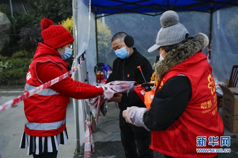 12月9日,在太平村一路口,志愿者(左一)为执勤村民和工作人员送来慰问用品。 在成都疫情防控最前线——郫都区郫筒街道太平村,各项疫情防控工作正有序开展。太平村各路口均有工作人员和志愿者站岗执勤,严控人员进出。 目前,成都市已将郫都区郫筒街道太平村、成华区崔家店华都云景台小区、郫都区唐昌镇永安村8组升级为中风险区,实施全面现场管控和消杀。同时,还对郫都区人民医院、太平村11组、沙西农贸批发市场、郫都区岷阳学校、中冶中央公园小区、相关酒吧、餐饮店等区域实施现场管控和消杀。 新华社记者 沈伯韩 摄