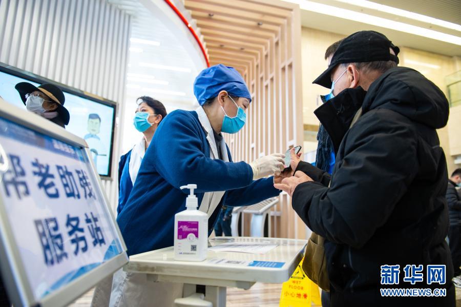 12月9日,在首都医科大学附属北京天坛医院“帮老助残服务站”,工作人员在帮助老年人核对手机上的挂号信息。新华社记者 陈钟昊 摄