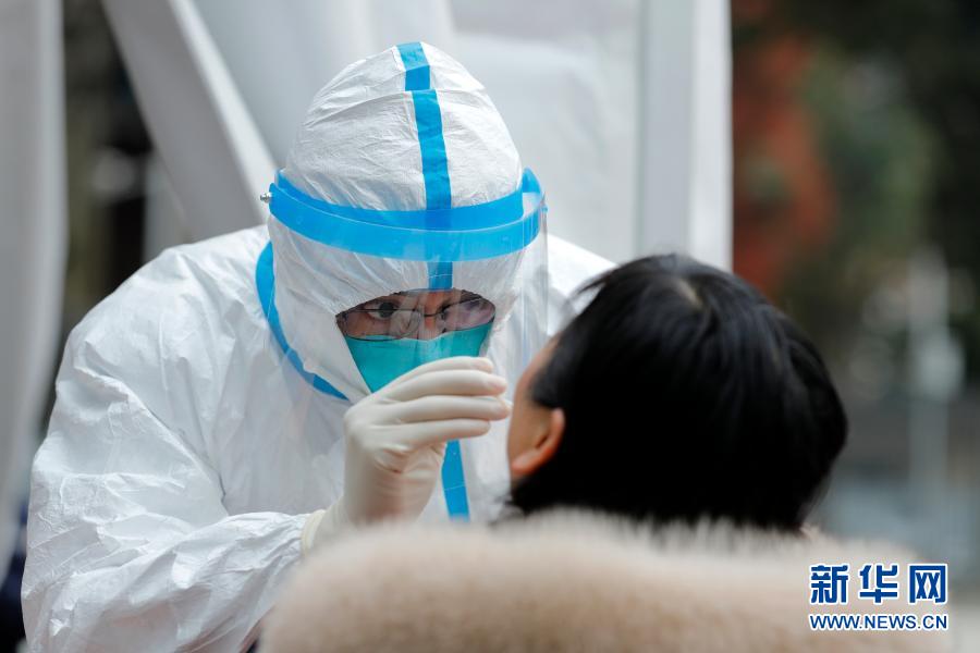 12月10日,在郫都区中医医院核酸检测点,医务人员对居民进行核酸取样。