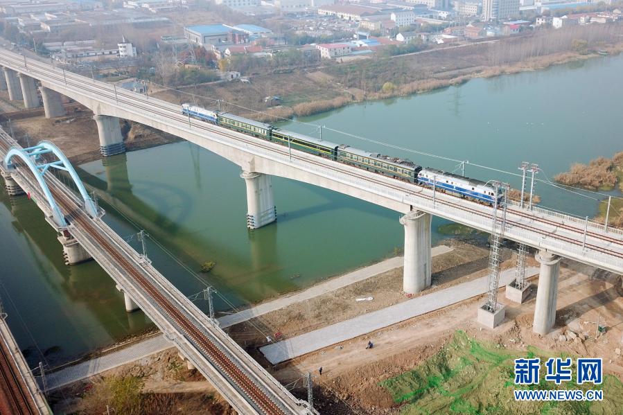 12月10日,一列检测列车行驶在江苏连云港境内(无人机照片)。