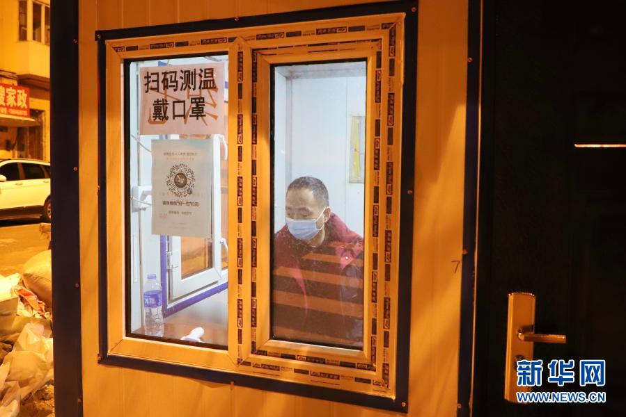 12月10日,工作人员深夜在绥芬河一处移动板房值守。
