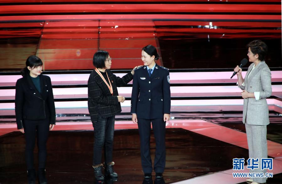 张桂梅(左二)在“时代楷模”发布仪式上介绍自己的两名学生(12月7日摄)。新华社记者 潘旭 摄