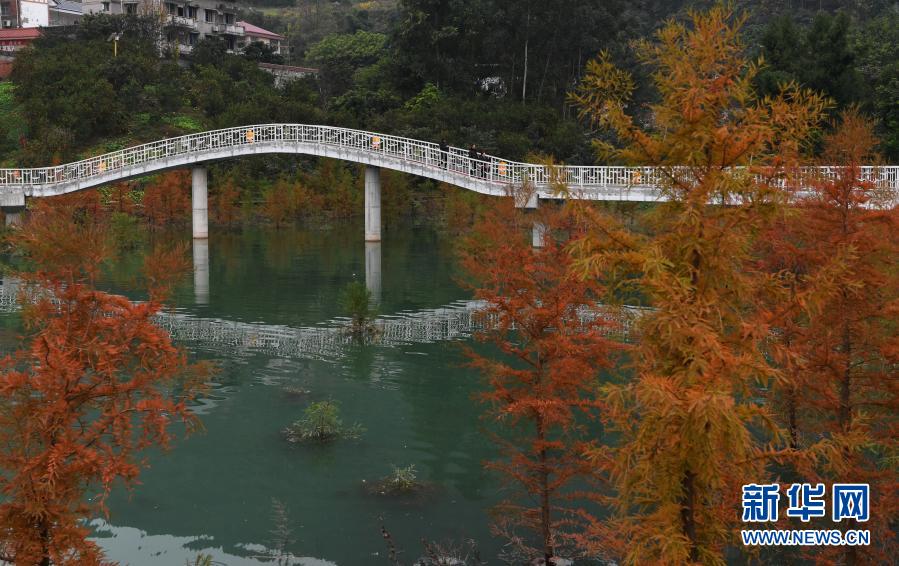 初冬时节,位于重庆市万州区大周镇的长江边,中山杉逐渐泛红,宛如“水中彩林”,成为一道亮丽的风景线。