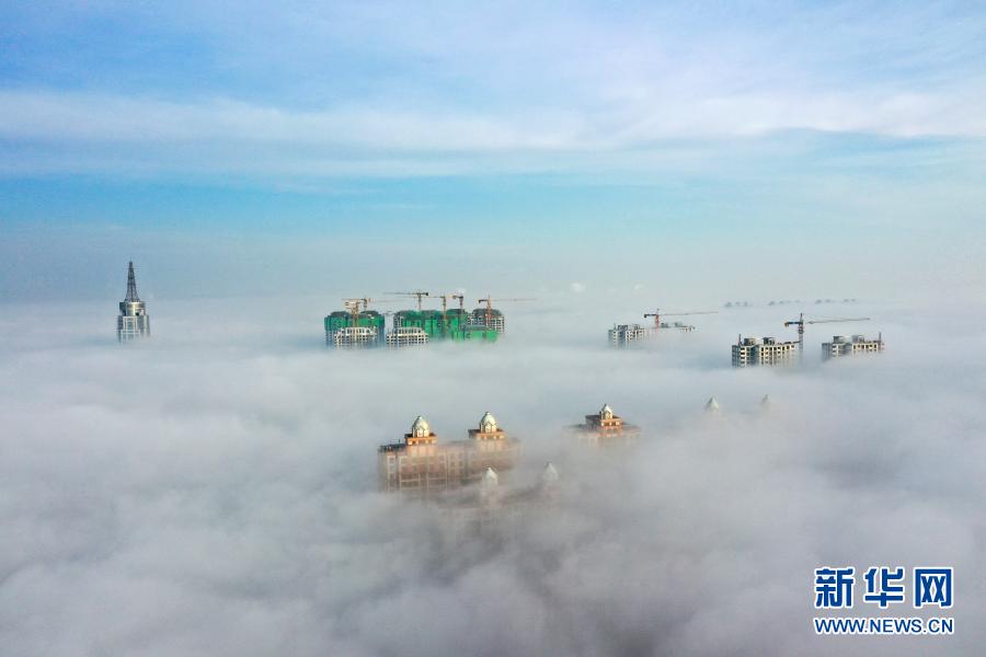当日,河北省邢台市市区出现平流雾景观,城市建筑在雾中若隐若现。