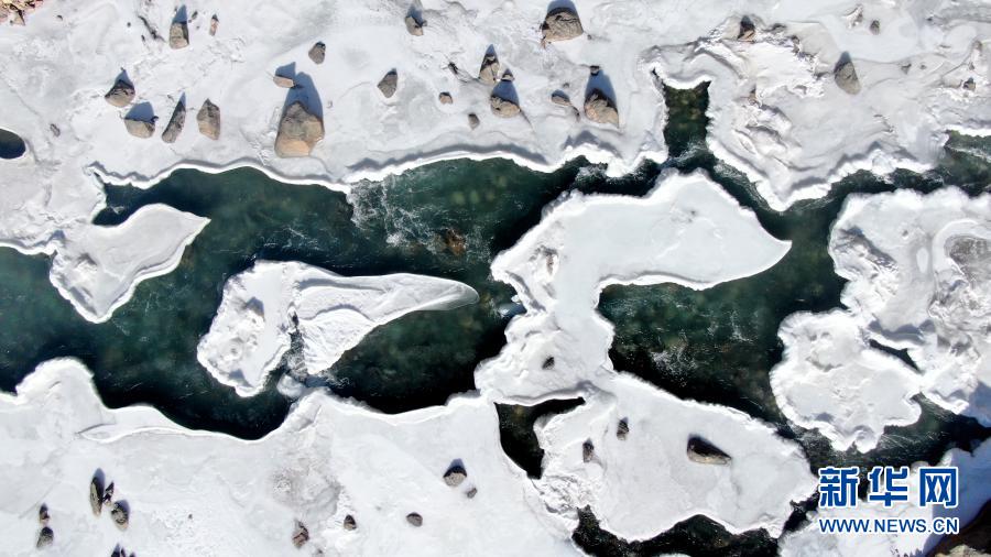 12月10日,黑河与冰雪相映成画(无人机照片)。