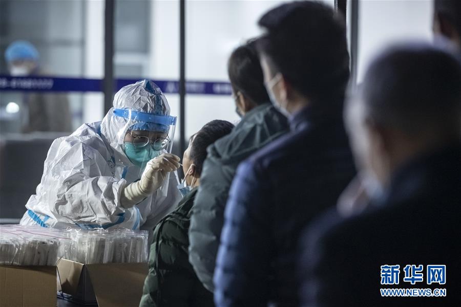 12月11日晚,在位于四川成都市郫都区的成都现代工业港核酸检测点,来自成都市青白江区人民医院的医务人员在为人们进行核酸检测。 当日,成都市郫都区新型冠状病毒肺炎疫情防控指挥部发布通告,从2020年12月11日18点00分开始,全面开展郫都区全员新冠肺炎疫情核酸检测,确保不漏一人。检测费用由区政府承担。 新华社记者 沈伯韩 摄