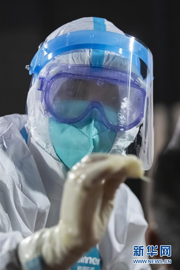 12月11日晚,在位于四川成都市郫都区的成都现代工业港核酸检测点,来自成都市青白江区人民医院的医务人员范晓林在为人们进行核酸检测。 当日,成都市郫都区新型冠状病毒肺炎疫情防控指挥部发布通告,从2020年12月11日18点00分开始,全面开展郫都区全员新冠肺炎疫情核酸检测,确保不漏一人。检测费用由区政府承担。 新华社记者 沈伯韩 摄