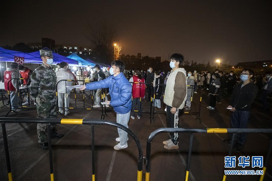 12月11日晚,在位于四川成都市郫都区的西华大学本部,学生在操场上排队准备进行核酸检测。 当日,成都市郫都区新型冠状病毒肺炎疫情防控指挥部发布通告,从2020年12月11日18点00分开始,全面开展郫都区全员新冠肺炎疫情核酸检测,确保不漏一人。检测费用由区政府承担。 新华社记者 沈伯韩 摄